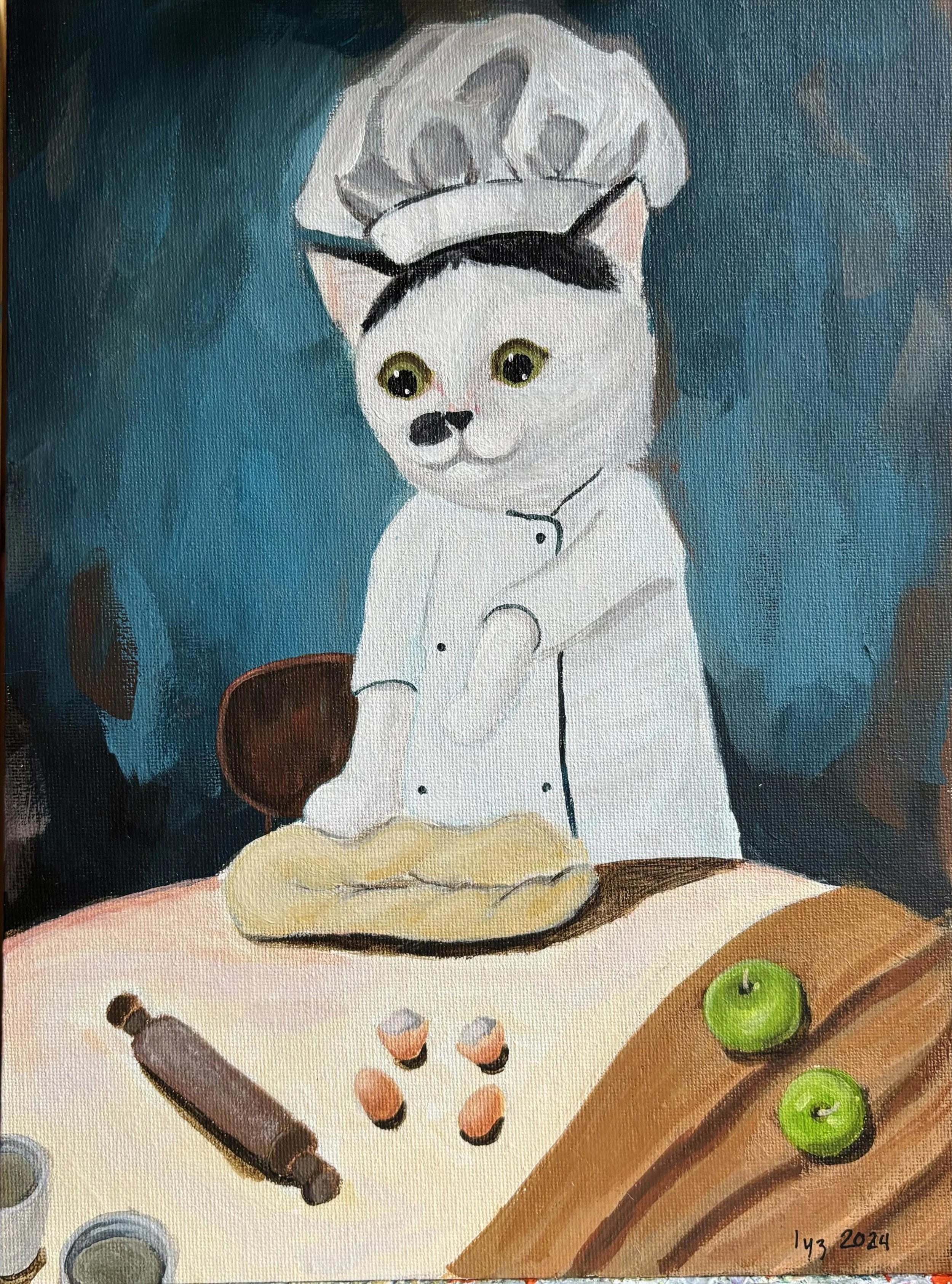 A painting of a cat dressed as a chef wearing a traditional white chef's outfit and hat, standing at a kitchen counter with baking ingredients and tools, including two green apples, a rolling pin, and small containers. The cat is holding a tray of do