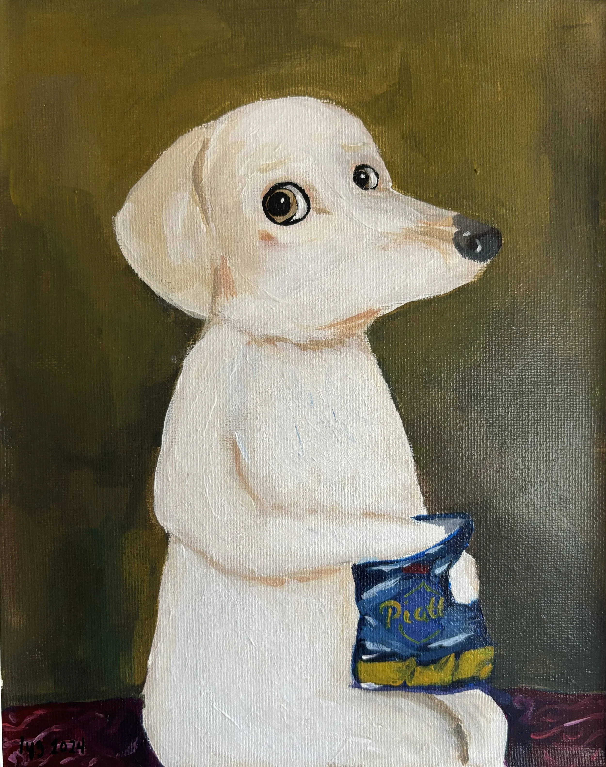 Painting of a cute white puppy sitting with a bag of snacks labeled 'Peanuts'.
